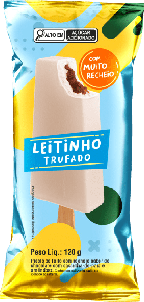 A Paleta de Leitinho Trufado é feita com um cremoso picolé de leite, recheado com um delicioso sabor de chocolate, castanha-do-pará e amêndoas.