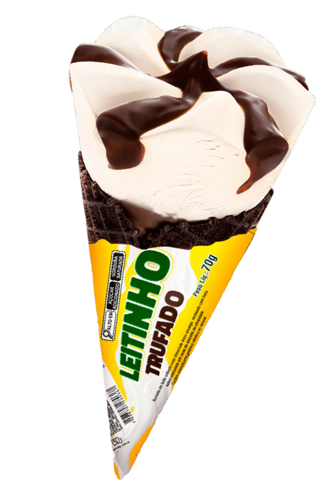 O Cone de Leitinho Trufado une o sorvete de leite coberto com chocolate meio amargo, com recheio de trufa de chocolate, em um cone crocante de sabor chocolate.